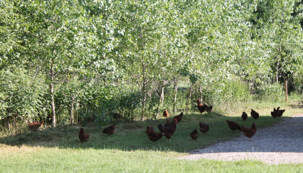 In addition to grain cultivation for organic seed production, 22 dairy cattle, some pigs and, most recently, chickens are kept in the agroforestry system. The farmer experiments with two chicken breeds. Bress chickens (Les Bleus) are raised as a dual-purpose breed. Characteristic features are the snow-white plumage, the blue legs and the red comb, symbolizing le drapeau tricolore. The laying hens are New Hampshire, a robust breed with good laying performance, which is widespread in organic farming. The chickens can use the agroforestry system on grassland on the one hand and the orchard meadows on the other. The milk is processed in the farm’s own cheese dairy and the daughter Johanna runs an excellent restaurant in the restored former cowshed.