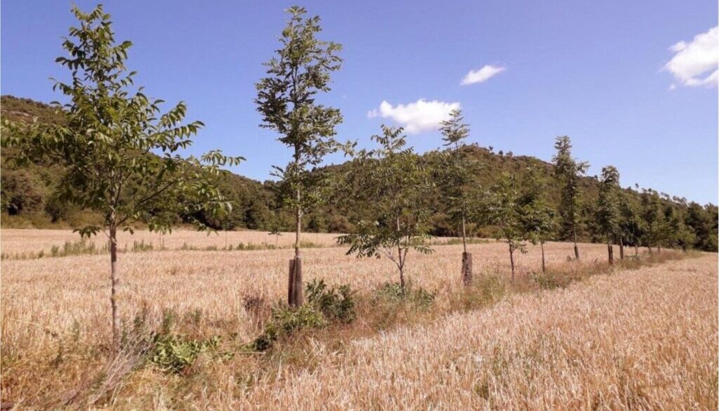 Alley cropping system combining winter cereal with hybrid walnut (Juglans x intermedia) and ash (Fraxinus excelsior) for valuable timber production, in Puig-Reig, Barcelona. (Photo credits: AGS-CTFC-AgroForAdapt)