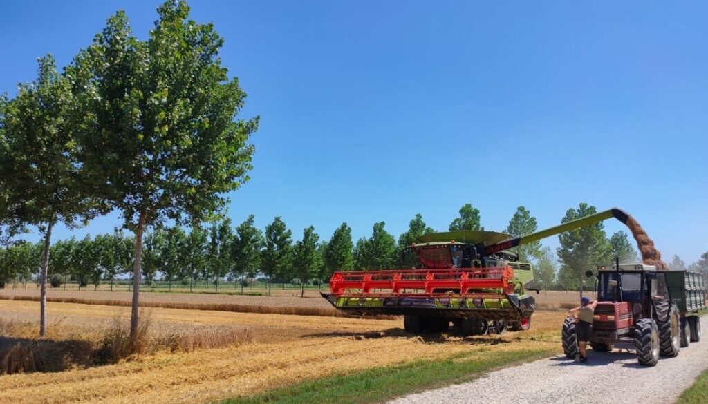 Picture of the Master degree thesis cover of Simone Piotto taken at the “Sasse Rami” pilot farm of Veneto Agricoltura, located in Ceregnano (Rovigo, NE Italy): Mechanical harvest of common wheat in the alley-cropping system with 4 years old poplar trees.