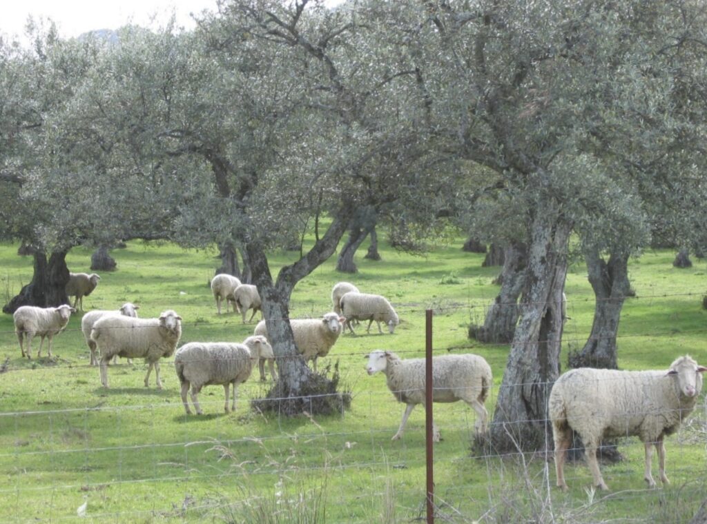 Sheep grazing in an olive tree orchard in Mirabel, Cáceres